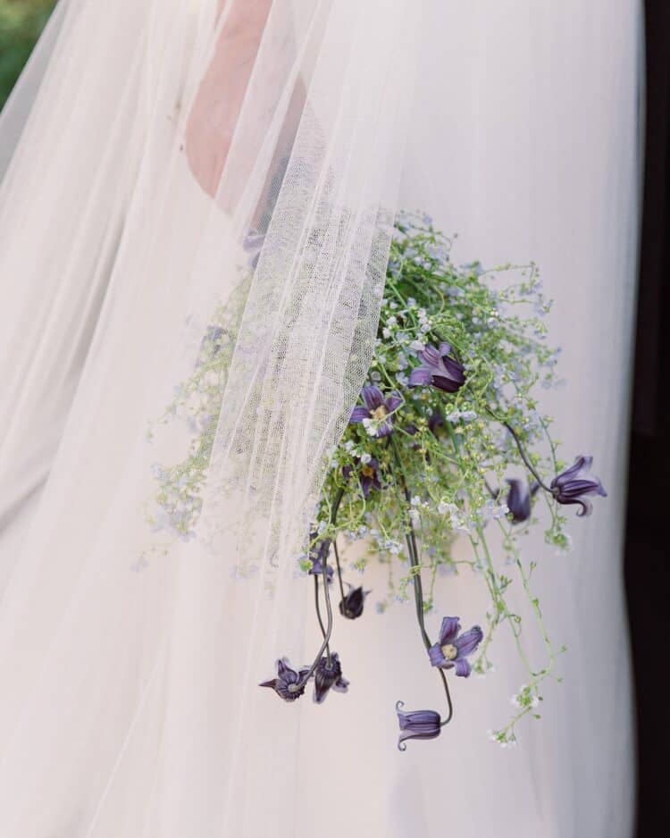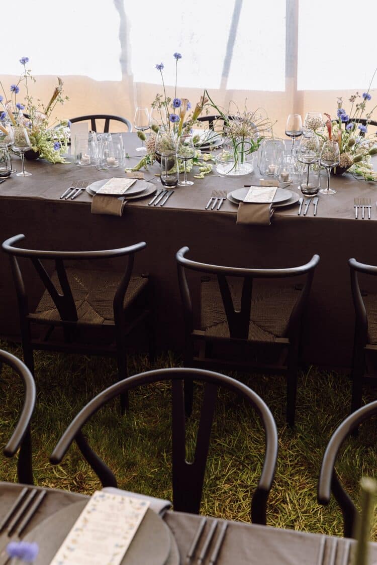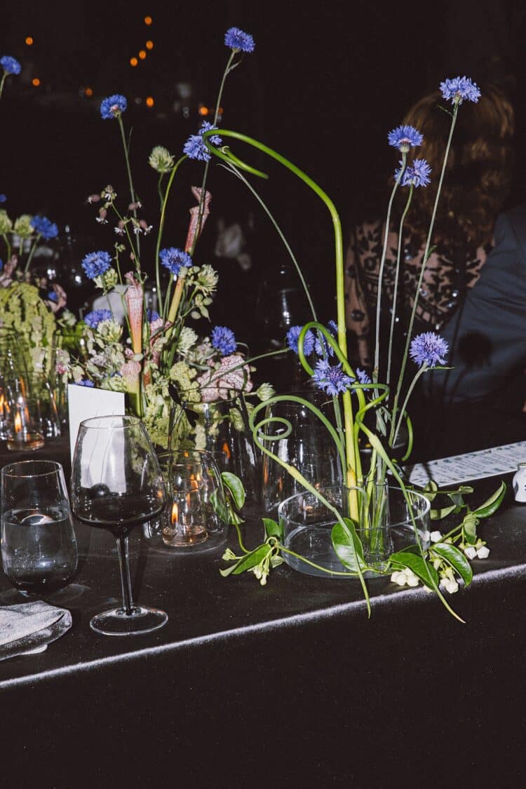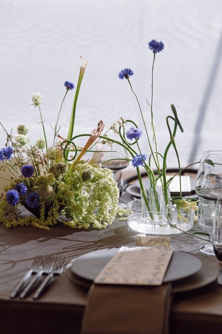 A little meadow pocket square for Colin. A delicate blue forget me not bouquet for Lora. A floating installation above the tables in the dinner tent inspired by Cy Twombly paintings. Scribbly vines and drippy blue blooms dancing down the tables.