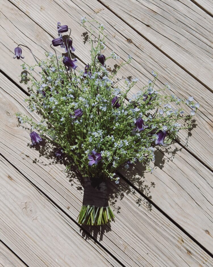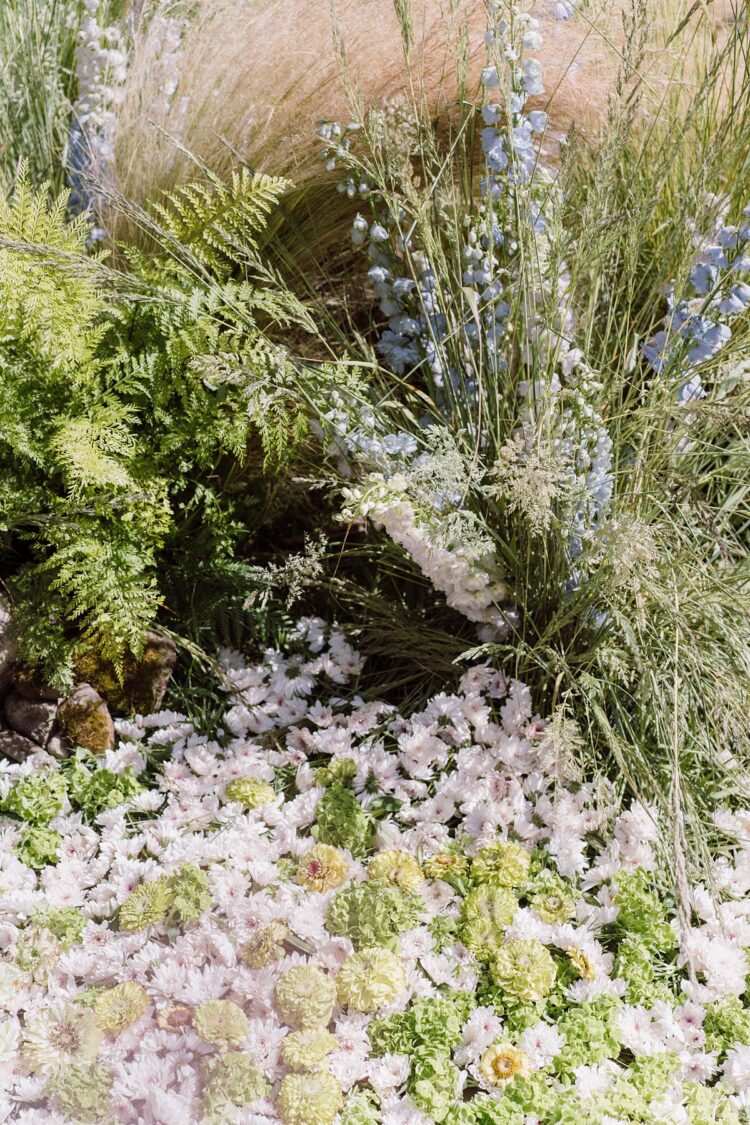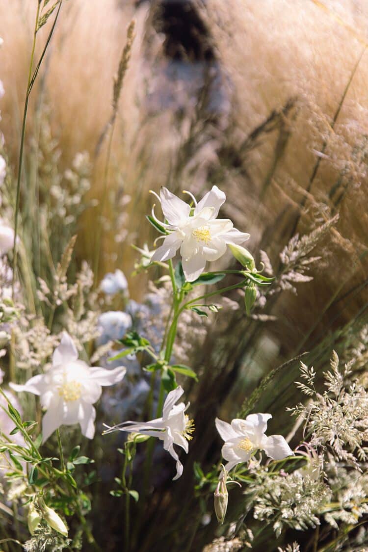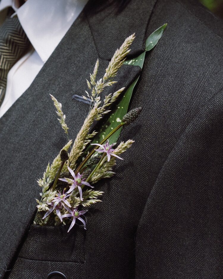 A little meadow pocket square for Colin. A delicate blue forget me not bouquet for Lora. A floating installation above the tables in the dinner tent inspired by Cy Twombly paintings. Scribbly vines and drippy blue blooms dancing down the tables.