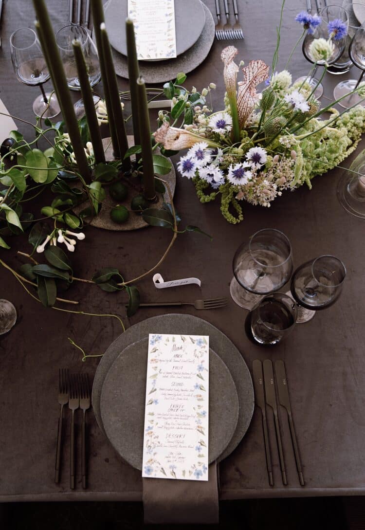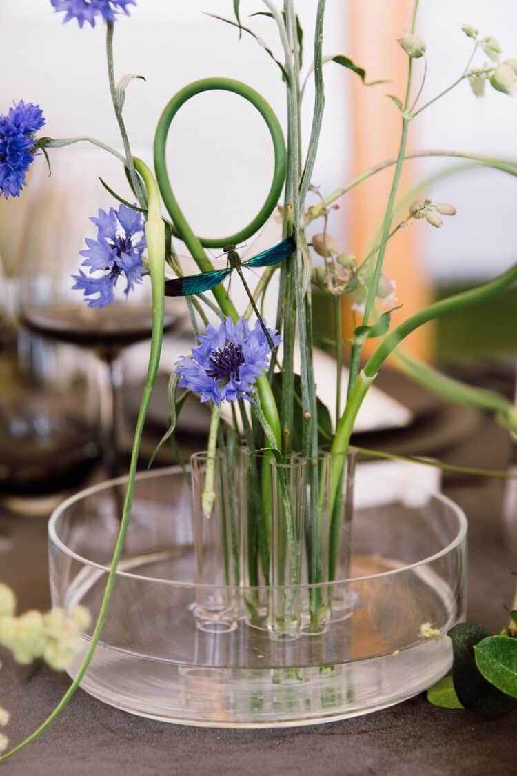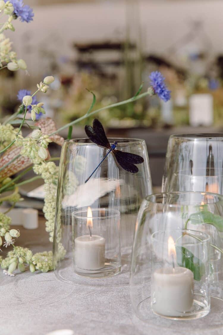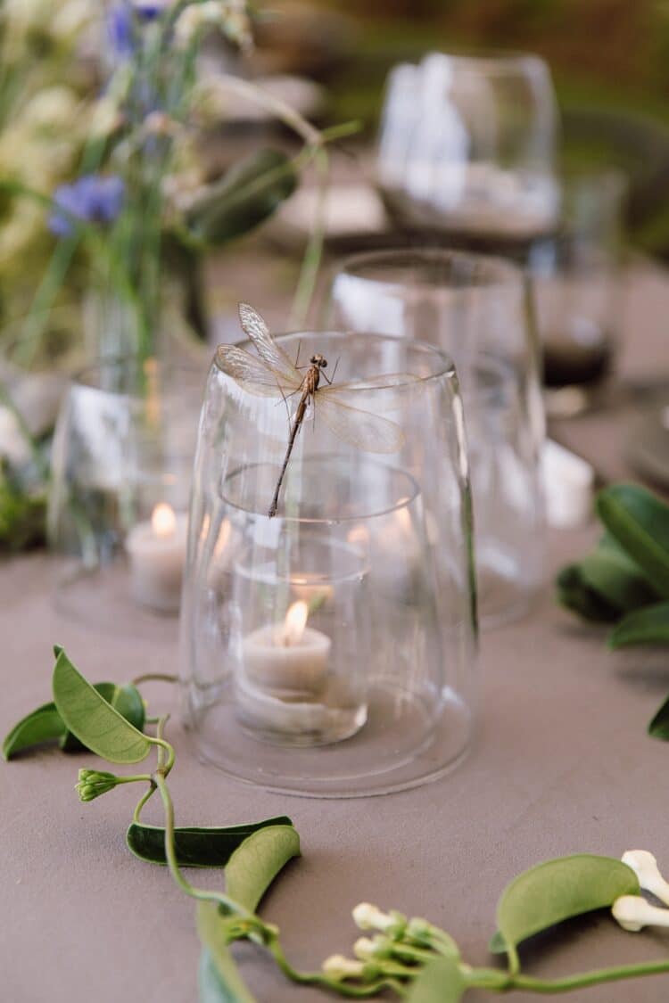 As a memento mori to represent the fragility that is life and love-dragonflies and moths dotted the tablescape.