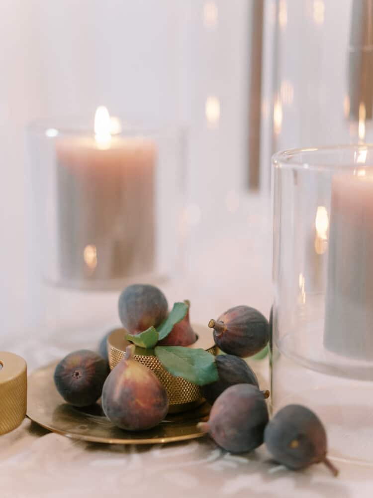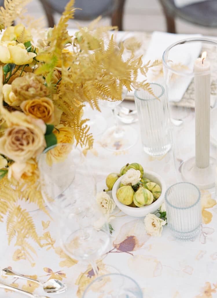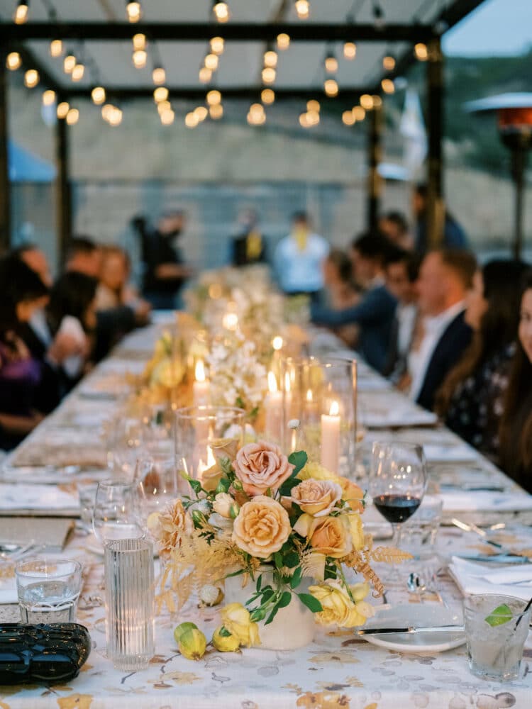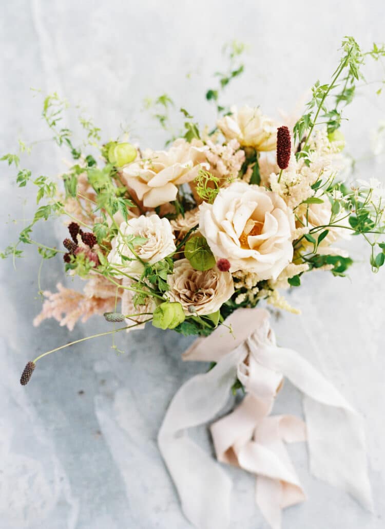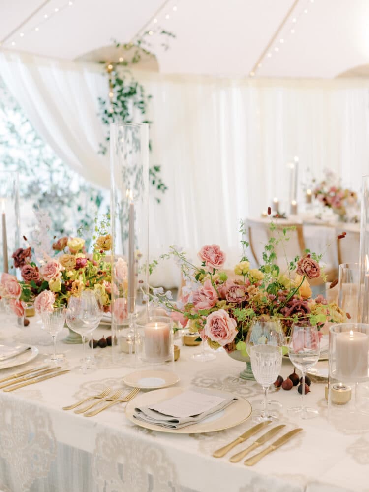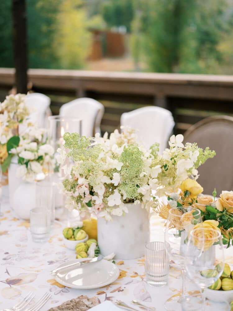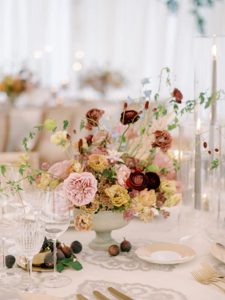 Leanne and Steven wed on the mountainside at Blue Sky in early Autumn, just as the mountainside was starting to change color. A wild floral arch filled with autumn dahlias, crab apples, lisianthus and dancing butterfly ranunculus lined the aisle. Guests dined inside a round tent with a wild, greenhouse inspired floral installation above-head. Lush, feminine garden rose arrangements accented with love in the puff vines and bowls of figs trailed down the tabletops between tall candlesticks.