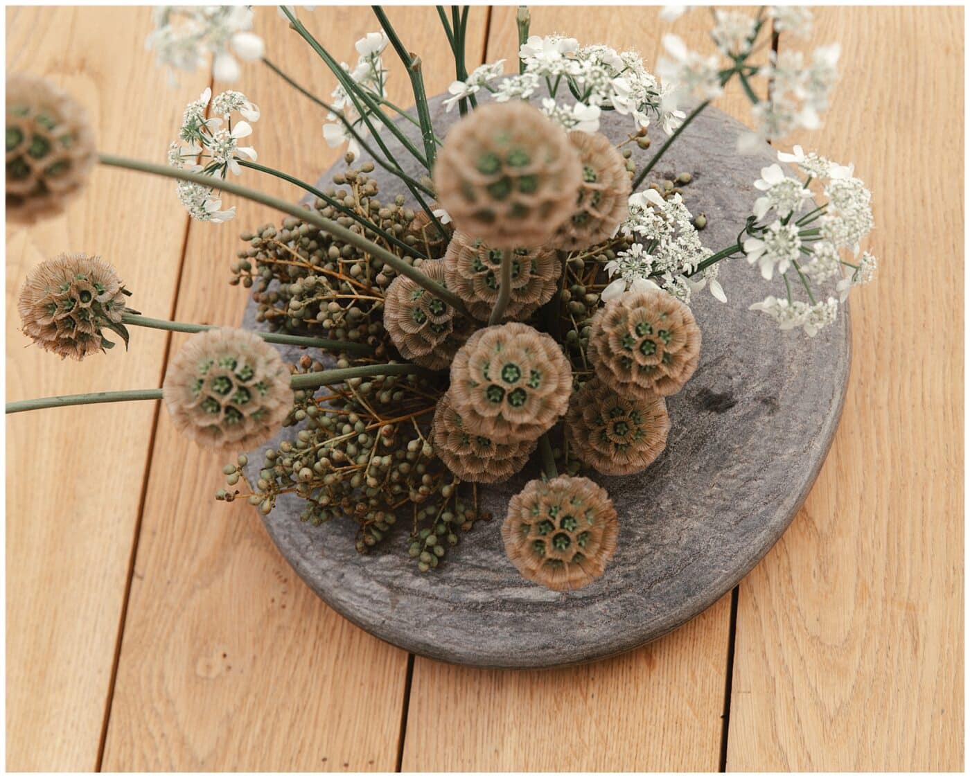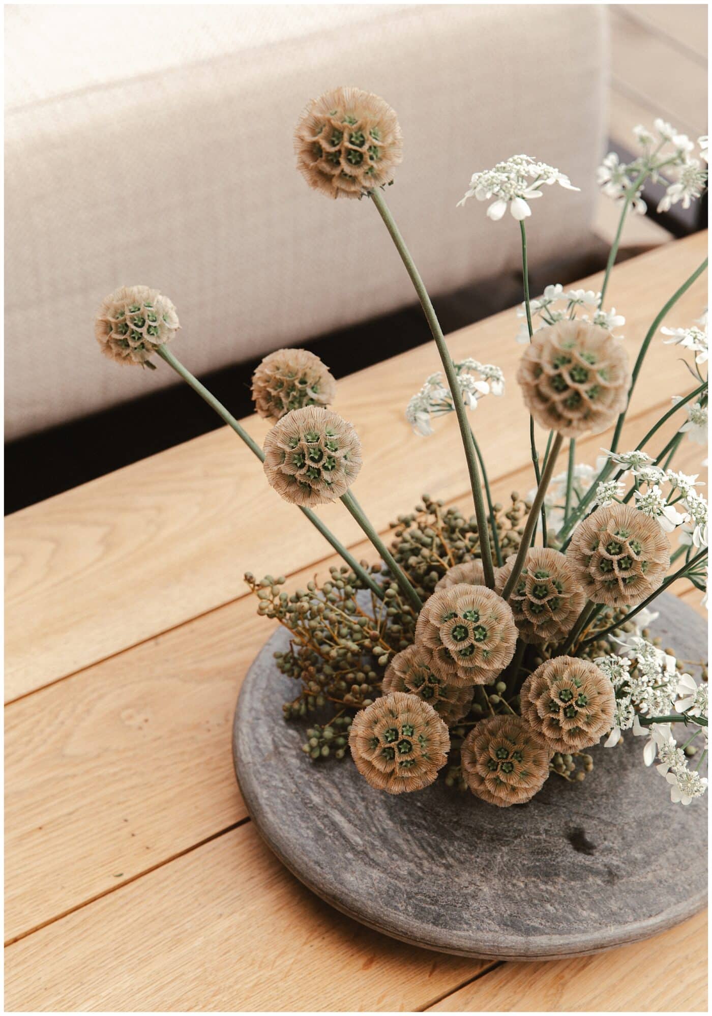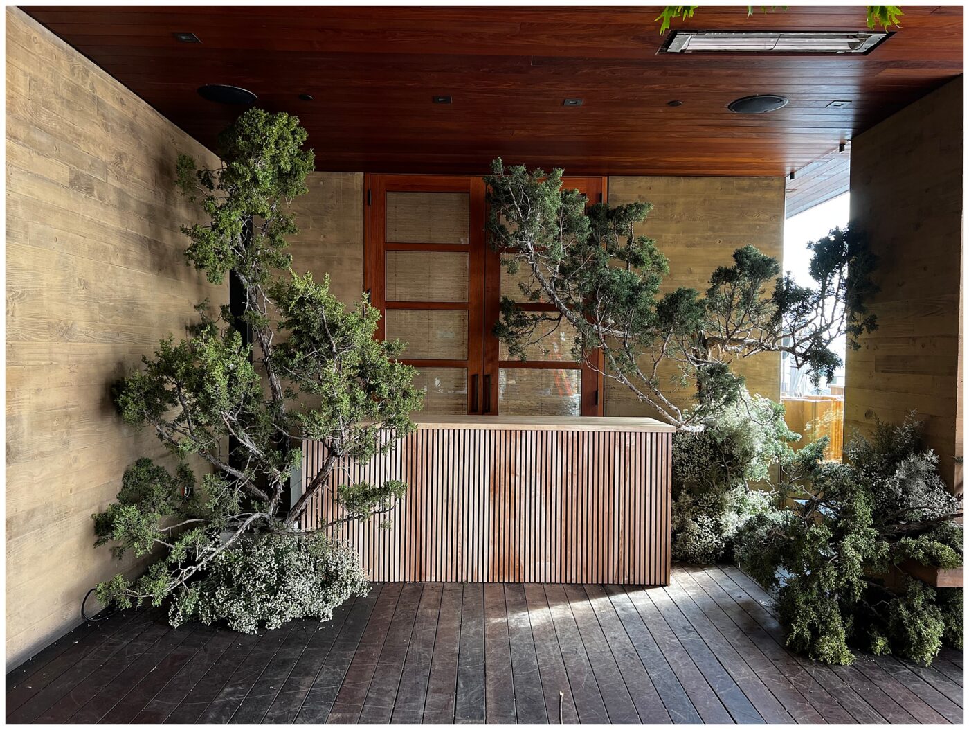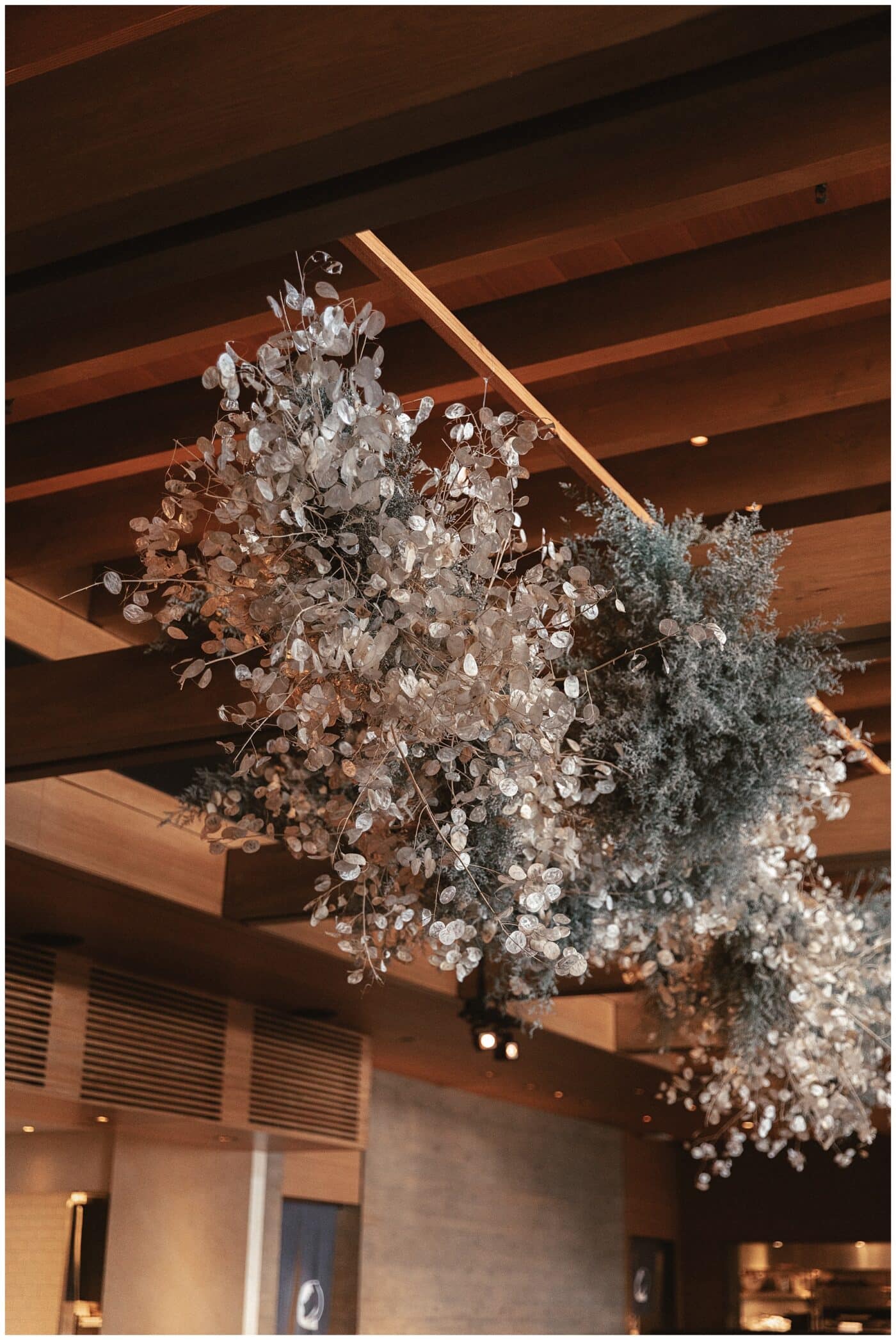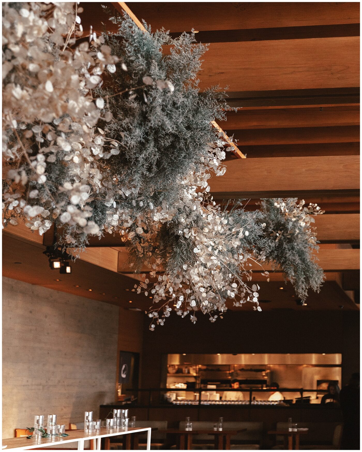 A pathway of potted bonsai trees and a mossy candle created a private pathway to the restaurant entrance. Inside the restaurant a lunaria seed pod installation drifted through the space, suspended in mid air. Sculptural trees and branches were installed throughout the space, on ledges and on bar tops, creating what felt like a living garden environment for the party.