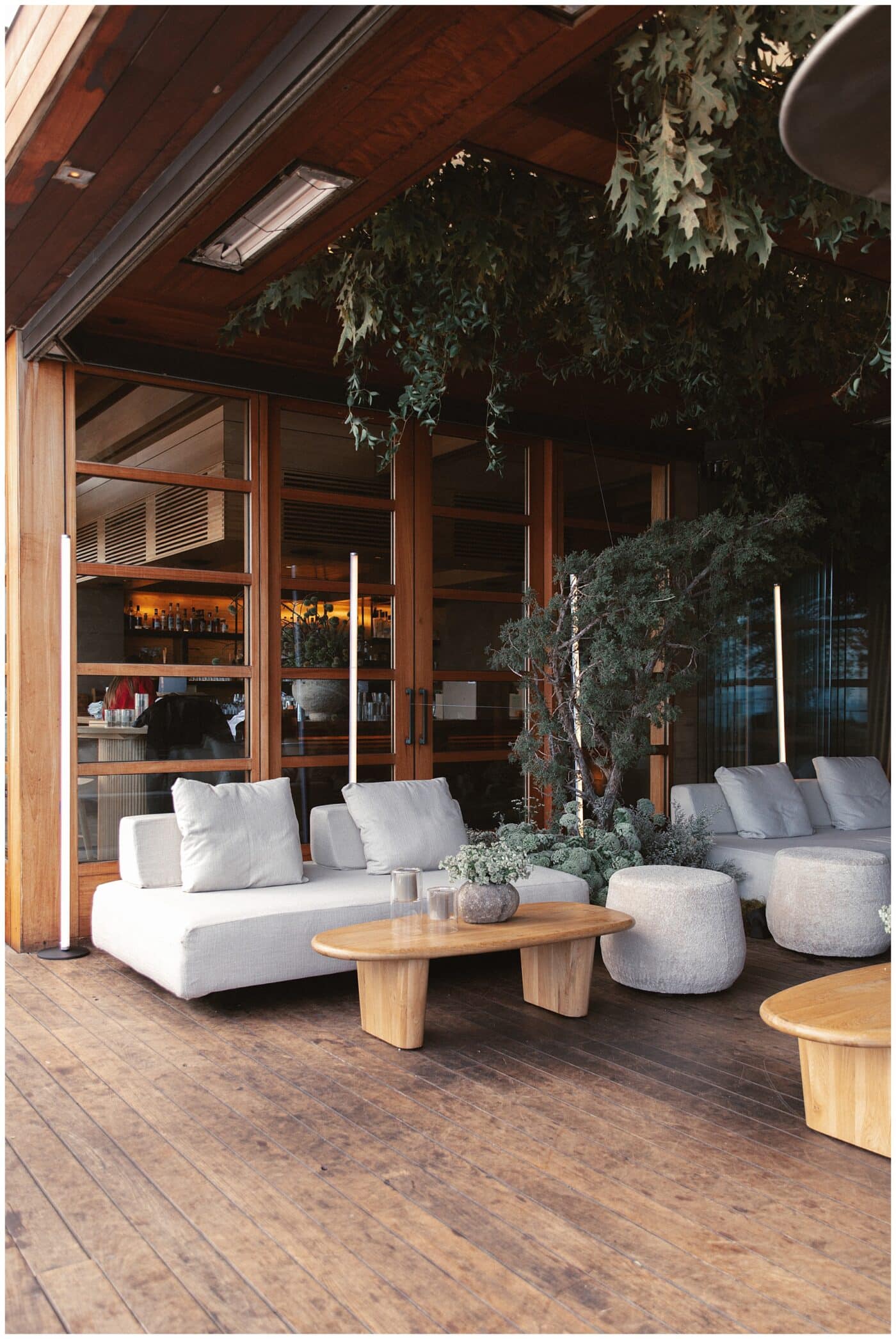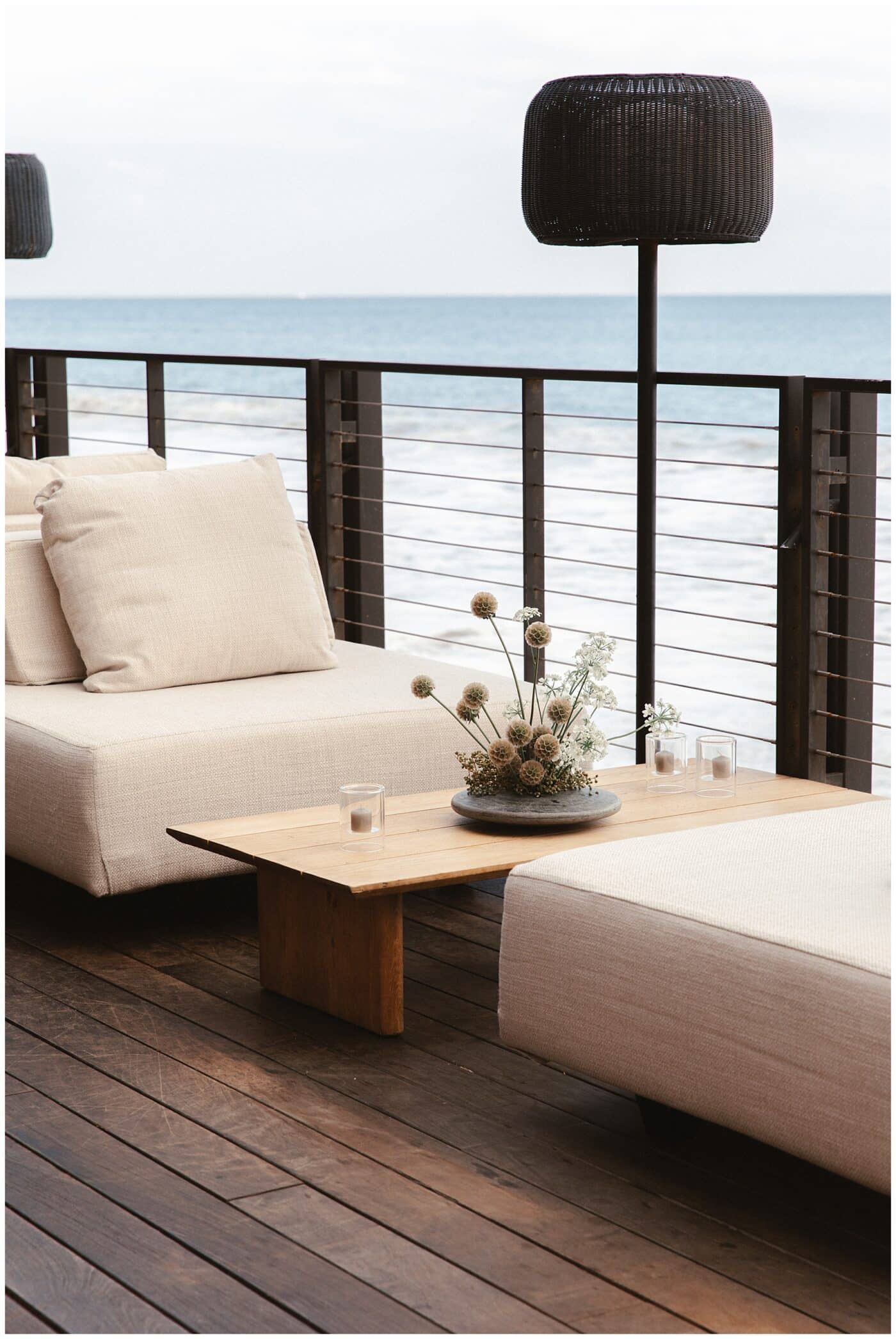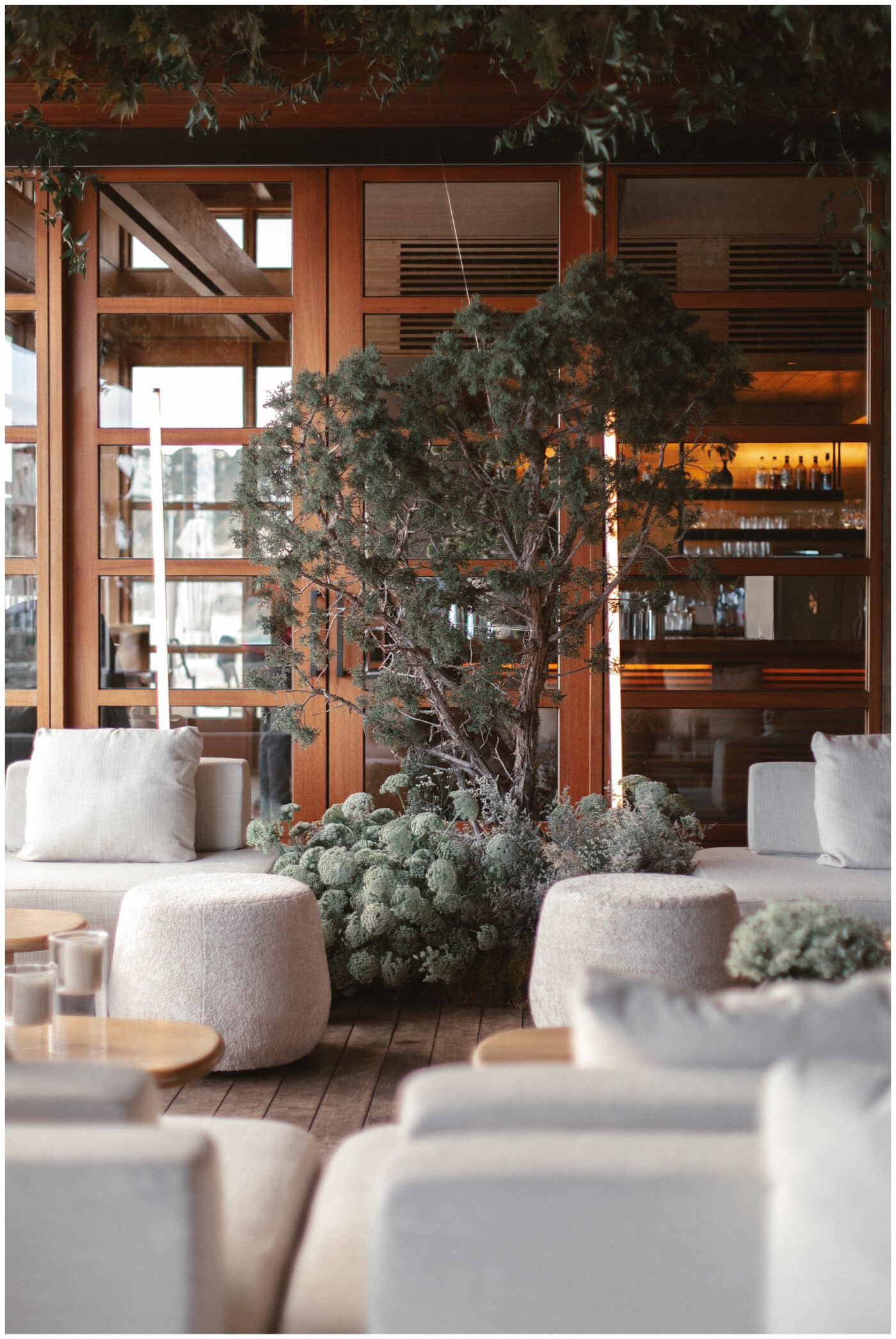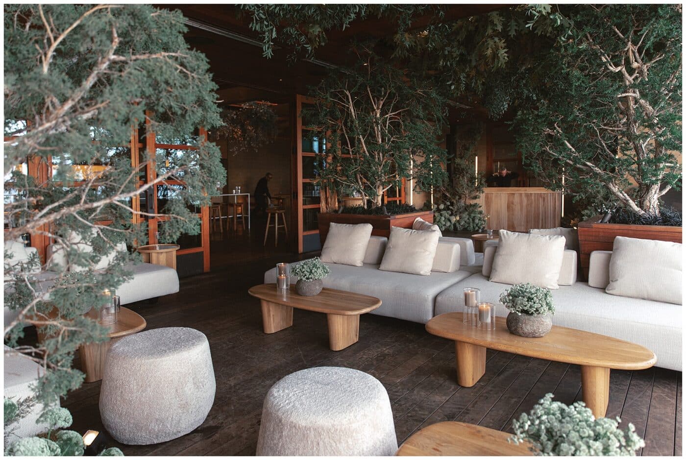 On the patio, the Juniper tree forest we created around the DJ booth made a cozy atmosphere for the dance floor. Guests were able to enjoy the music, the ocean breeze, and the lounge areas all evening.