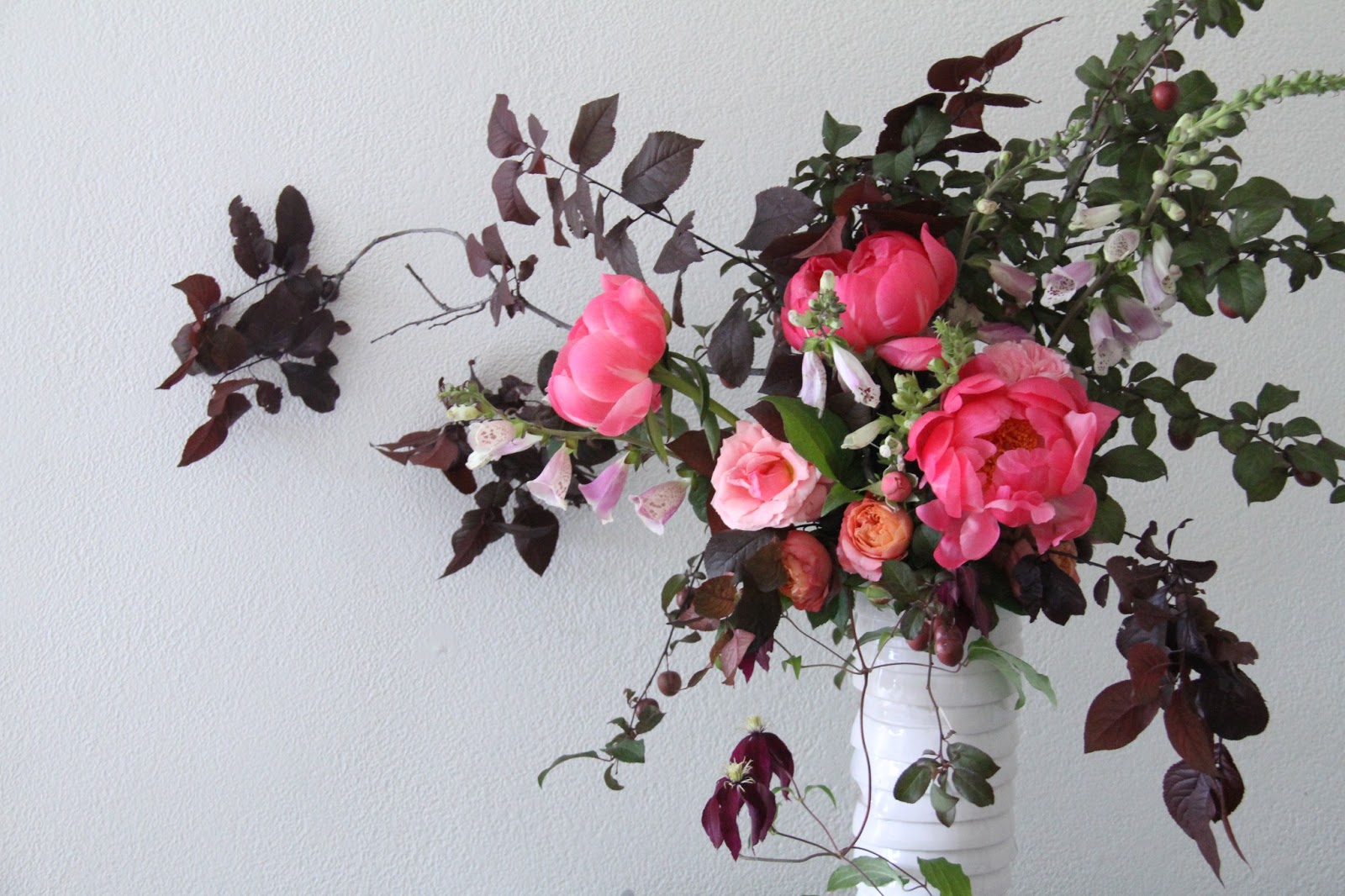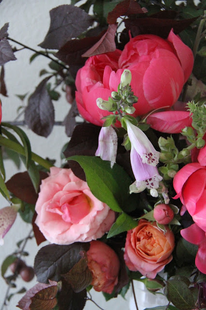 Pink May 1, 2013 Random A few photos of an arrangement from last June. Coral charm peonies, garden roses, foxglove, and plum foliage.