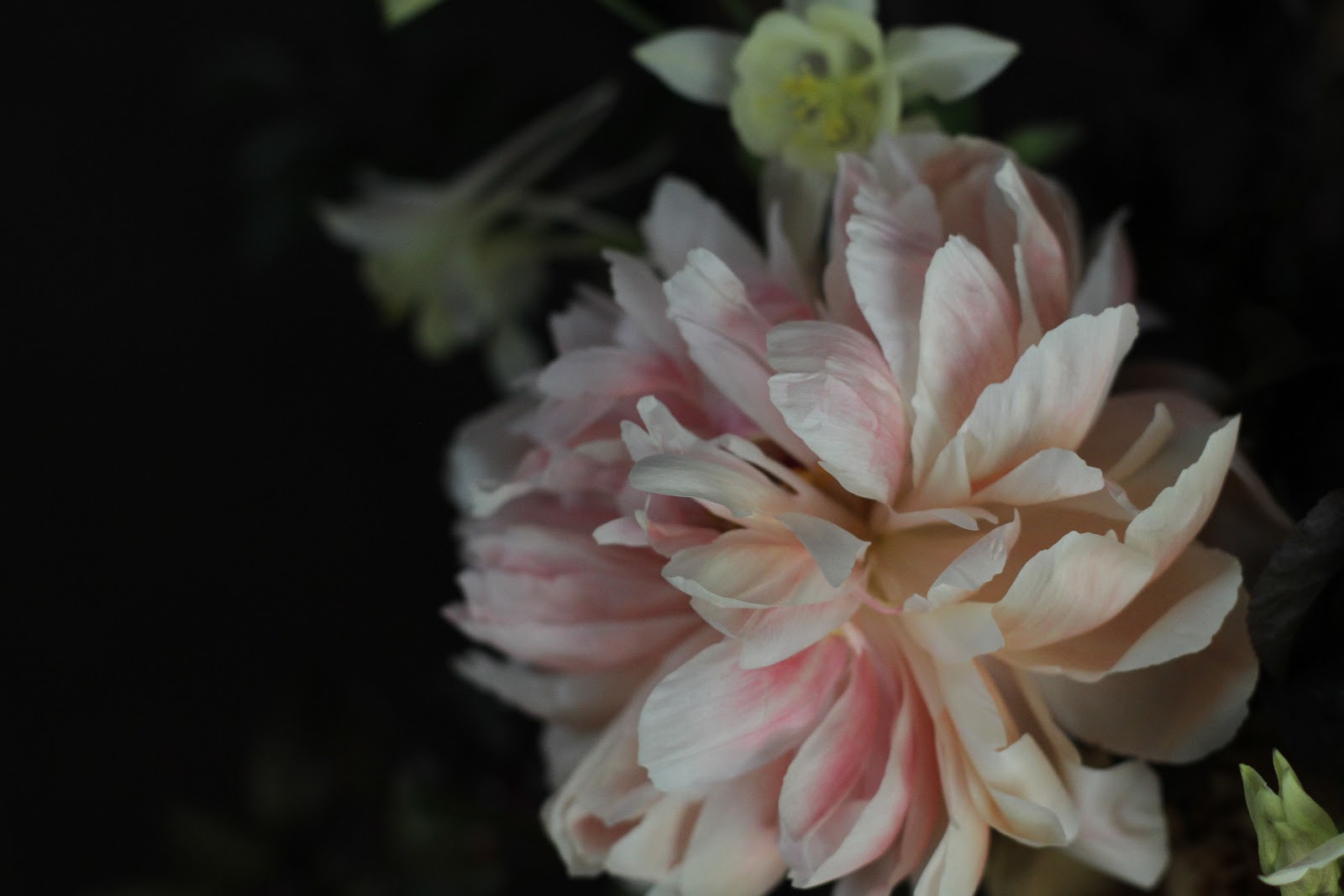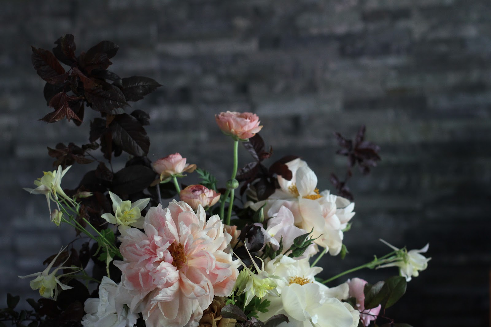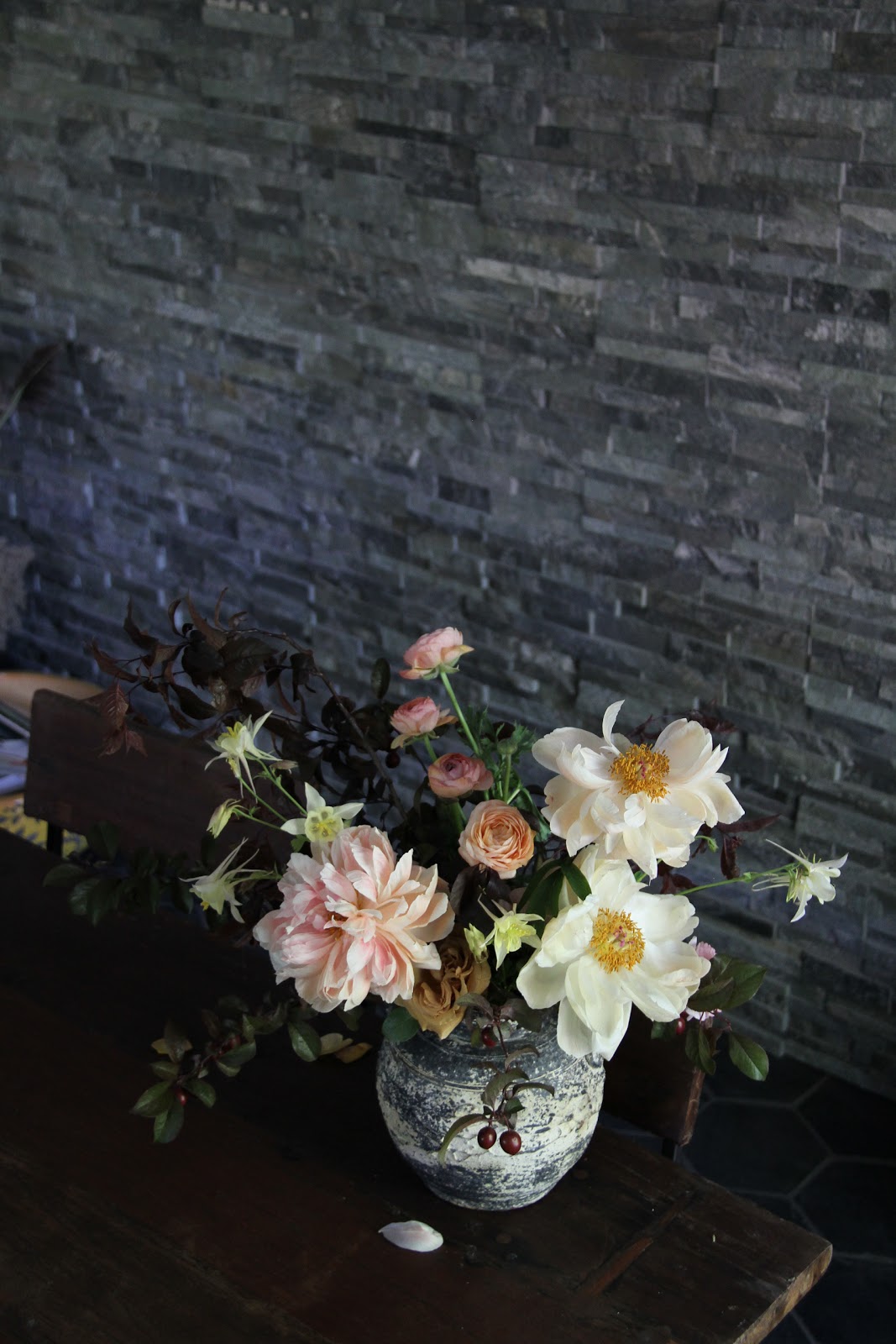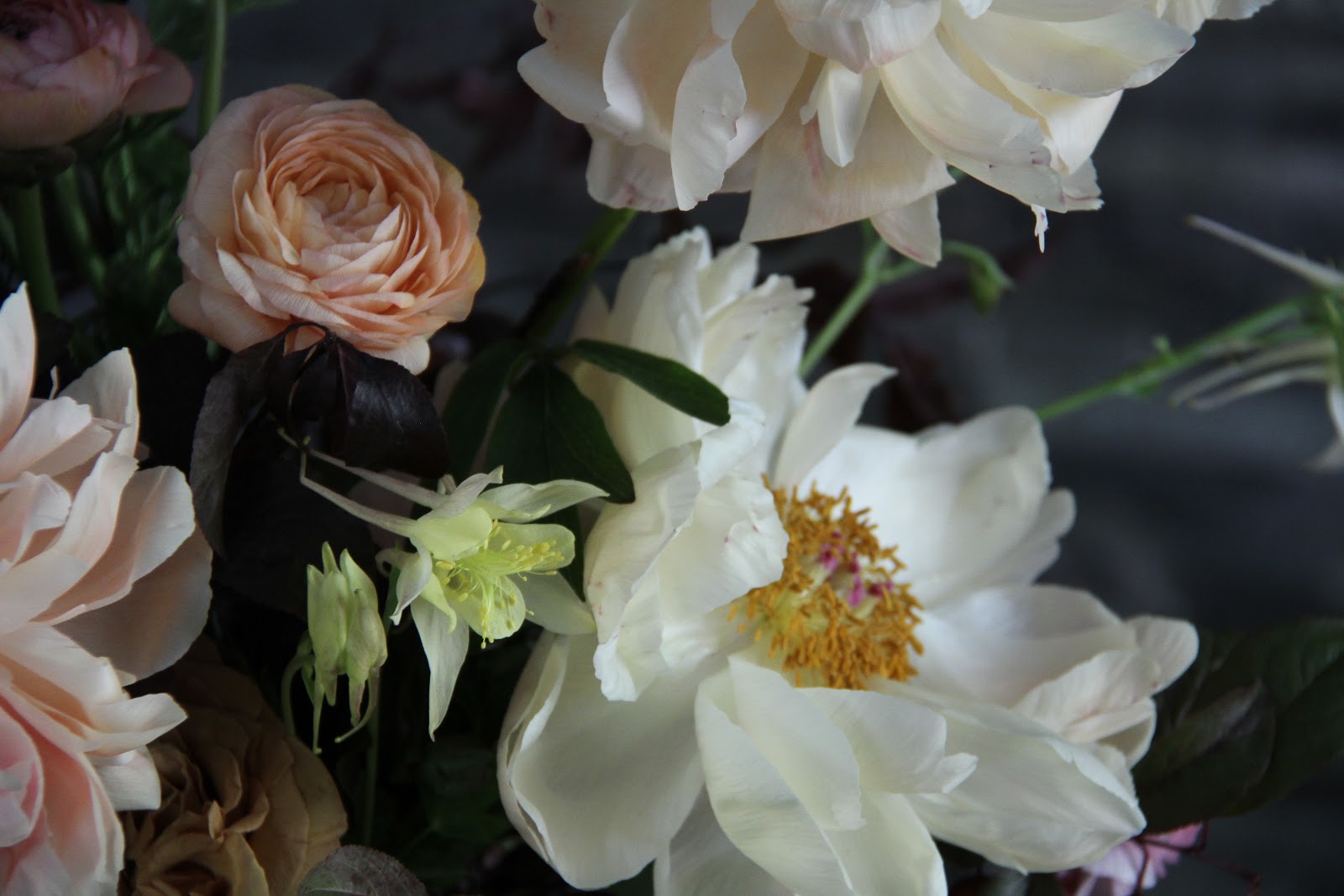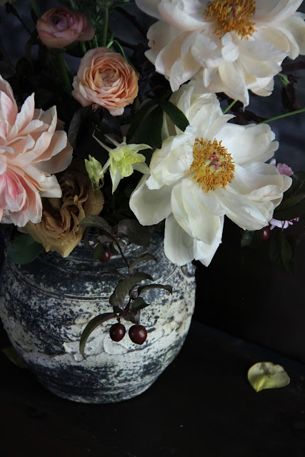 Coral charm peonies at the end of their fade, ranunculus, crab apple, plum foliage and columbine…from this spring. This arrangement is sort of deceiving I think because it could easily be from the fall too. That is why I am posting it now.