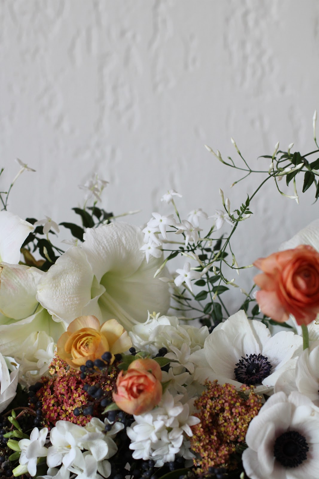 I wish I had time to photograph everything I made. It is hard to set up flowers that you really love at their final destination and know that you will never see them again. . The arrangement above from early February was HUGE. I could only snap a phone picture and then I went home to make an arrangement out of leftovers, below.